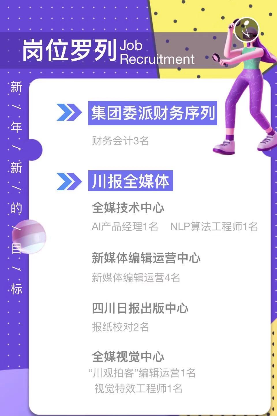 1952年9月1日,由毛澤東同志題寫報名的中共四川省委機關(guān)報《四川日報》,與省人民政府同日誕生。2000年9月12日,四川日報報業(yè)集團正式成立。從“一張報紙打天下”發(fā)展到10報3刊和百余個新媒體,總期均發(fā)行量約140萬份,新媒體用戶覆蓋超過1.5億;川報全媒體集群、封面?zhèn)髅郊?、專業(yè)媒體集群三大特色全媒體矩陣初具規(guī)模,傳媒產(chǎn)業(yè)、文化旅游、會展會務(wù)等多元產(chǎn)業(yè)日新月異,一個新型主流媒體集團加快崛起。新時代,新使命,新征程。年輕的朋友們,四川日報報業(yè)集團歡迎您的加入,攜手并進,在這充滿機遇挑戰(zhàn)的新時代奏響屬于奮斗者的強音。