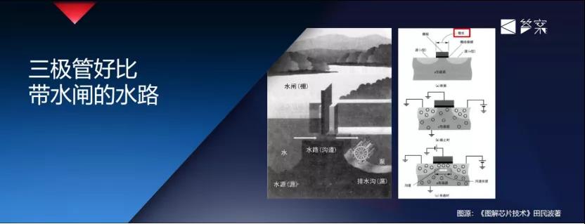 把水流換成電流,這就完全是對(duì)三極管的描述。左邊的水源、右邊的水泵和中間的水閘,就對(duì)應(yīng)三極管的三個(gè)極,源極、漏極和柵極。水閘的高度,就對(duì)應(yīng)柵極上的電壓。