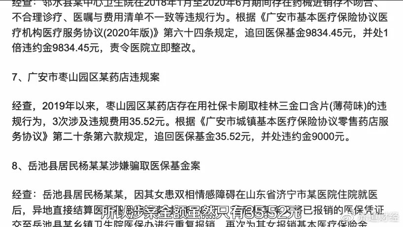 ?講一個(gè)有趣的例子,四川廣安通報(bào)的一起醫(yī)保騙保案。某藥店讓顧客用社保卡刷卡,買桂林三金口含片,而這款含片其實(shí)是保健品,不在醫(yī)保保險(xiǎn)范圍內(nèi)。所以涉案金額,雖然只有35.52元,也被追回了,還罰了9000元。