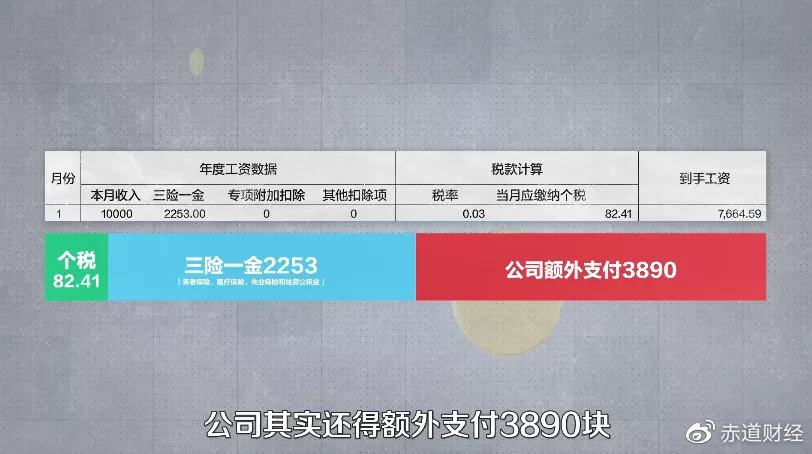 ?10000元的月薪,稅只扣了82.4元,但養(yǎng)老保險(xiǎn)、醫(yī)療保險(xiǎn)、失業(yè)保險(xiǎn)和住房公積金,扣掉了2253元。雖然同事們經(jīng)常痛心錢被扣得太多了,但我們要知道,公司其實(shí)還得額外支付3890元。