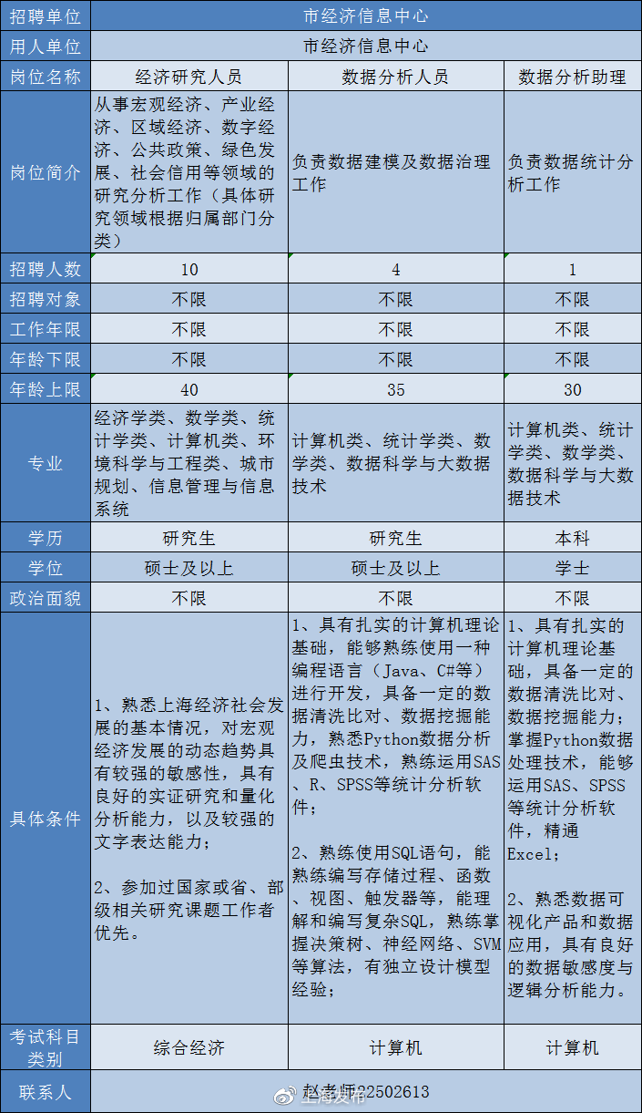 經(jīng)濟(jì)研究人員:從事宏觀經(jīng)濟(jì)、產(chǎn)業(yè)經(jīng)濟(jì)、區(qū)域經(jīng)濟(jì)、數(shù)字經(jīng)濟(jì)、公共政策、綠色發(fā)展、社會(huì)信用等領(lǐng)域的研究分析工作。(具體研究領(lǐng)域根據(jù)歸屬部門分類)