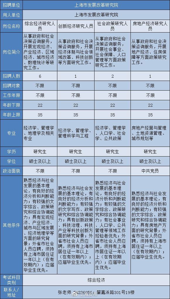 經(jīng)濟(jì)研究人員:年齡40周歲以下(1980年4月以后出生),經(jīng)濟(jì)學(xué)類、數(shù)學(xué)類、統(tǒng)計(jì)學(xué)類、計(jì)算機(jī)類、環(huán)境科學(xué)與工程類、城市規(guī)劃或信息管理與信息系統(tǒng)專業(yè),碩士研究生及以上學(xué)歷;熟悉上海經(jīng)濟(jì)社會(huì)發(fā)展的基本情況,對宏觀經(jīng)濟(jì)發(fā)展的動(dòng)態(tài)趨勢具有較強(qiáng)的敏感性;具有良好的實(shí)證研究和量化分析能力,以及較強(qiáng)的文字表達(dá)能力;參加過國家或省、部級相關(guān)研究課題工作者優(yōu)先。