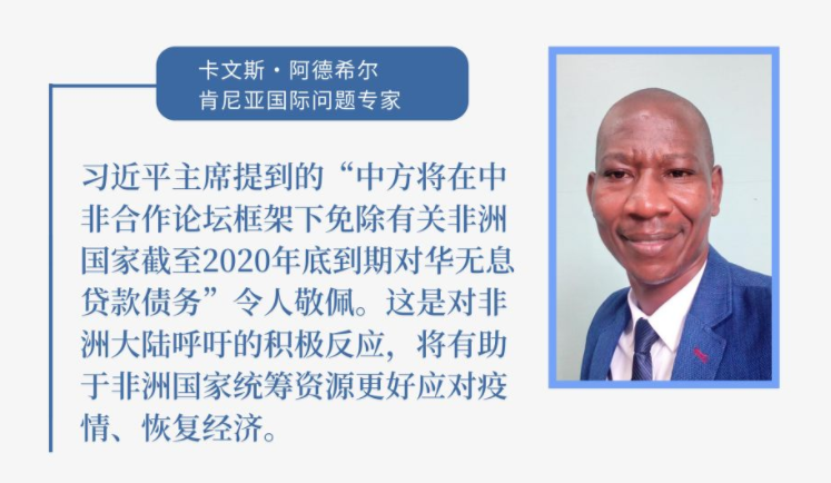 在不久前舉行的第73屆世界衛(wèi)生大會(huì)視頻會(huì)議開(kāi)幕式上,習(xí)主席承諾,中國(guó)將同二十國(guó)集團(tuán)成員一道落實(shí)“暫緩最貧困國(guó)家債務(wù)償付倡議”。在此次峰會(huì)上,習(xí)主席明確表示,中方將在中非合作論壇框架下免除有關(guān)非洲國(guó)家截至2020年底到期對(duì)華無(wú)息貸款債務(wù),同國(guó)際社會(huì)一道,加大對(duì)疫情特別重、壓力特別大的非洲國(guó)家的支持力度,包括進(jìn)一步延長(zhǎng)緩債期限。